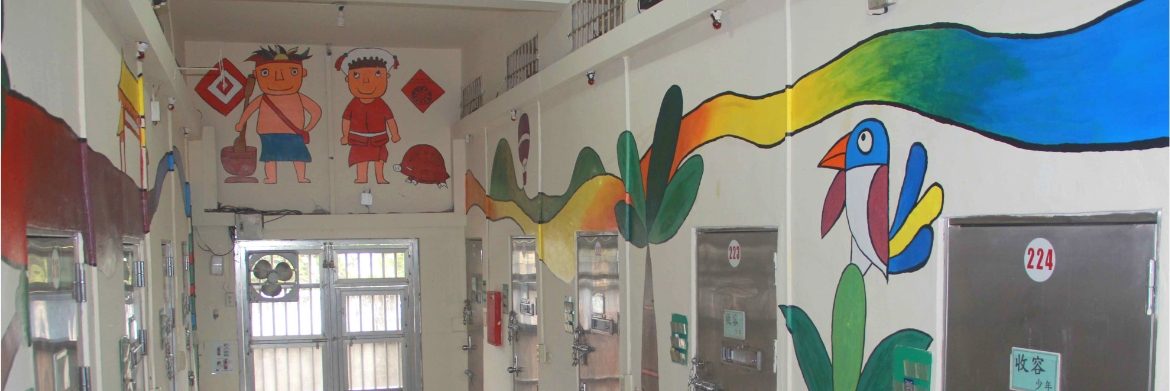 以花蓮風土為發想,將少觀所舍房外廊道彩繪,營造友善兒少收容環境
